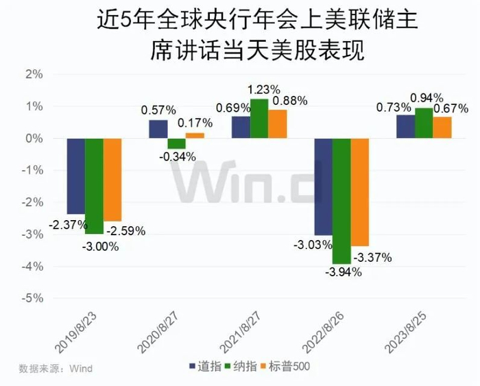 历年在杰克逊霍尔全球央行年会上,美联储主席鲍威尔讲话都引起美股波动。Wind数据显示,最近5年央行年会上,鲍威尔讲话当天美股上涨时幅度不大,但下跌时基本是大跌。其中2019年和2022年,鲍威尔的演讲都吓崩了美股,当天三大股指重挫分别在2%以上和3%以上。2023年市场波澜也不小,虽然当天小幅上涨,不过在鲍威尔讲话的前一天,道指当日创下五个月最大点数跌幅,纳指跌近2%。