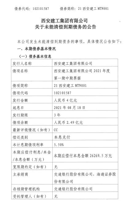 8月20日,据中国货币网发布的公告,陕西首屈一指的国企建工巨头西安建工集团有限公司(下称“西安建工”)未能按期足额兑付2021年度第一期中期票据本息。