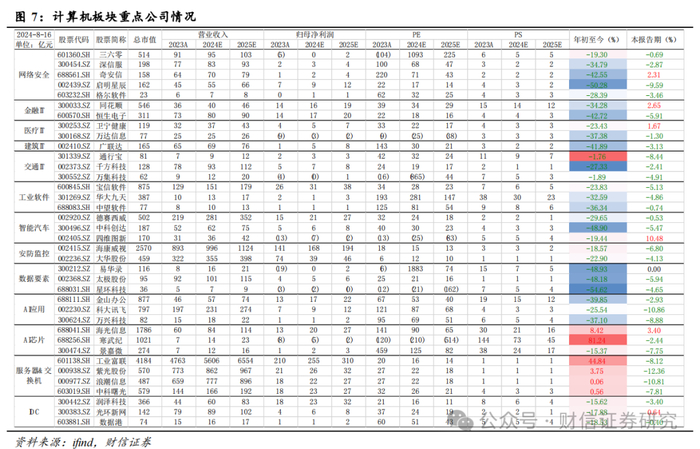 【行情回顾】报告期内申万计算机指数下跌2.63%,行业排名第27位。本报告期内(2024年7月29日-2024年8月16日)市场,上证指数下跌0.40%,沪深300指数下跌1.87%,创业板指下跌4.10%,申万计算机指数下跌2.83%,落后上证指数2.43个百分点,落后沪深300指数0.96个百分点,在申万一级行业中排名第27位。重点公司方面,涨幅前三为四维图新(+10.48%,智能汽车),海光信息(+3.40%,AI芯片)和同花顺(+2.65%,金融IT)。