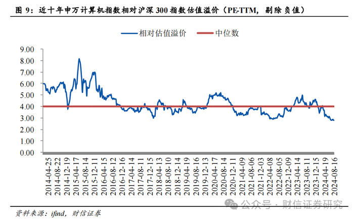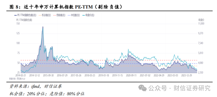 至2024年8月16日,申万计算机指数PE-TTM(剔除负值)为31.22倍,位于近十年的0.37%分位数;申万计算机指数相对沪深300指数的估值溢价(PE-TTM,剔除负值)为2.79倍,位于近十年的0.00%分位数。