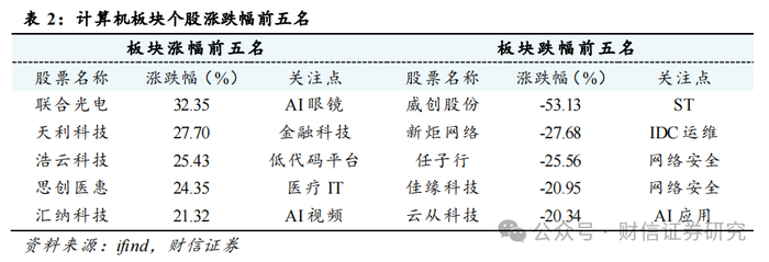 重点公司方面,涨幅前三为四维图新(+10.48%,智能汽车),海光信息(+3.40%,AI芯片)和同花顺(+2.65%,金融IT)。