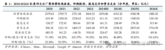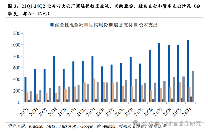 【行业观点】北美四大云厂商发布24Q2财报,合计资本支出同比增长59%,环比增长19%,24年全年资本支出指引维持乐观。Meta、Microsoft、Google和Amazon 24Q2的资本支出合计531亿元,同比增长59%,环比增长19%,增速达到近4年新高。AI算力景气度持续得到验证,虽然近期有投资者担心算力投入和现金流成长的匹配度问题,但我们认为1)在此阶段算力投资的军备竞赛仍是第一要务,根据Google的CEO所言,公司认为在现阶段对于AI基础设施投资不足的风险远远大于投资过剩的风险。2)当下AI业务暂未产生较多正现金流的情况下,各云厂商的现金流也足以覆盖未来1-2年的算力投资高增速,24Q2四大云厂商合计经营性现金流1085亿元,回购股份、股息支付和资本支出三者合计占用经营性现金流的82%,现金流仍然比较充沛。根据我们的测算,从保障一定现金流冗余与股份回购+股息支付的稳定性的角度出发,北美四大云厂商在2024年还有足够的能力和意愿维持算力投资的高增速,我们在当期仍然看好AI高强度投资给AI算力产业链带来的业绩增长;后续在2025-2026年的某个阶段,各云厂商的经营策略、包括市场的考察重心将转向AI带来的收入增速和投资强度的匹配。