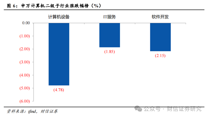 申万计算机二级子行业指数悉数下跌,其中IT服务指数下跌4.78%,软件开发指数下跌1.85%,计算机设备指数下跌2.15%。