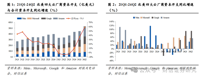 1.1 北美四大云厂商发布24Q2财报,合计资本支出同比增长59%,环比增长19%,24年全年资本支出指引维持乐观,后续算力投资仍有保障