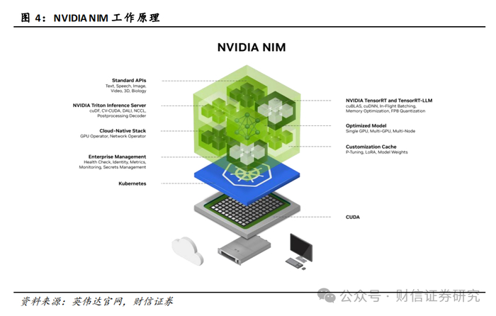 【行业观点】英伟达发布全新软件包NIM。NVIDIA NIM是一套经过优化的云原生微服务,旨在缩短AI上市时间。NIM作为英伟达在AI应用层的全新软件工具包,进一步巩固了英伟达在AI领域的竞争优势和护城河。国内的企业级AI开发者也有望通过英伟达中国的解决方案合作伙伴使用NIM服务进行AI模型部署。