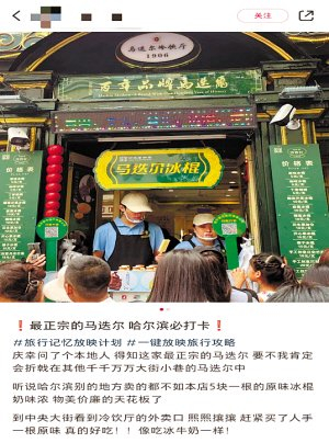 “来旅游前曾在小红书上向‘红薯’们征集过哈尔滨的吃喝玩乐项目,好多人向我推荐‘一定要吃哈尔滨的冰棍、冰糕’。”浙江游客“小星”来哈尔滨的第一站便去了中央大街,她的目的很明确——逛百年老街、吃马迭尔冰棍。记者了解到,“吃哈尔滨的冰棍”是不少游客来哈尔滨的必打卡项目。“不光是黑龙江人推荐我吃冰棍,还有很多IP是外地的网友也在向我推荐,我感觉不吃哈尔滨的冰棍真是白来一趟。”