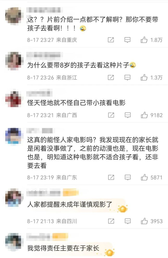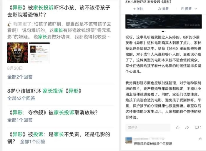 上映第2日,#异形吓坏8岁小孩家长投诉影城#的词条登上微博热搜榜第一。该词条阅读量1.4亿,讨论量2.3万,许多关于《异形》的消息下方都有对这件事发表看法的网友。
