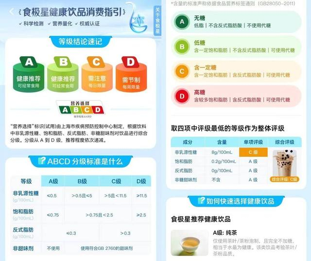 据介绍,打标依据的“营养选择”标识,由上海市疾控预防控制中心制定。现制饮品经过送检,根据其中非乳源性糖、饱和脂肪、反式脂肪、非糖甜味剂对饮品进行综合分级,并取四项中评级最低的等级作为整体评级。从A到D,推荐程度依次递减。例如标记为A级的饮品则代表无糖、低脂、不含反式脂肪酸且不使用代糖。