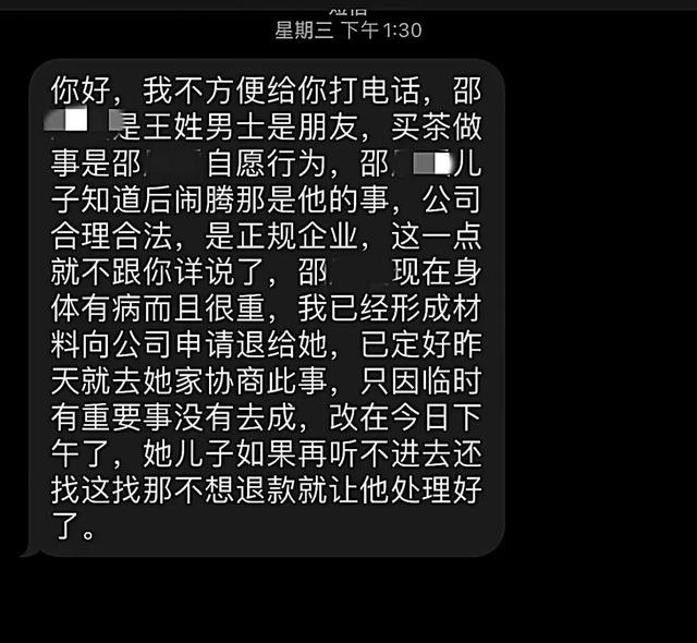 8月14日,记者收到一条短信:你好,我不方便给你打电话,邵女士是王姓男士的朋友,买茶做事是邵女士的自愿行为,邵女士的儿子知道后闹腾那是他的事,公司合理合法,是正规企业,这一点就不跟你详说了。邵女士现在身体有病而且很重,我已经形成材料,向公司申请退给她……
