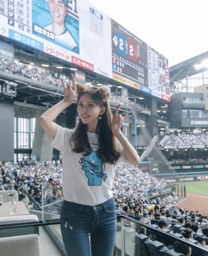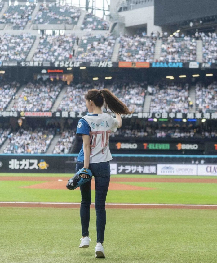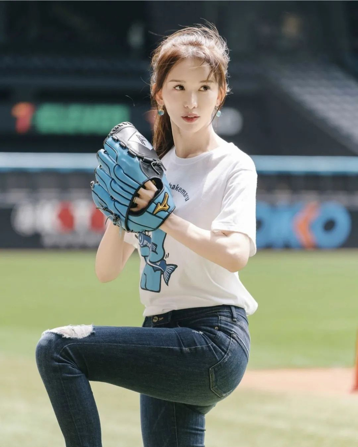 不久前,50岁的她在日本为棒球比赛开球。高马尾、运动T恤、紧身牛仔裤,满眼的青春活力: