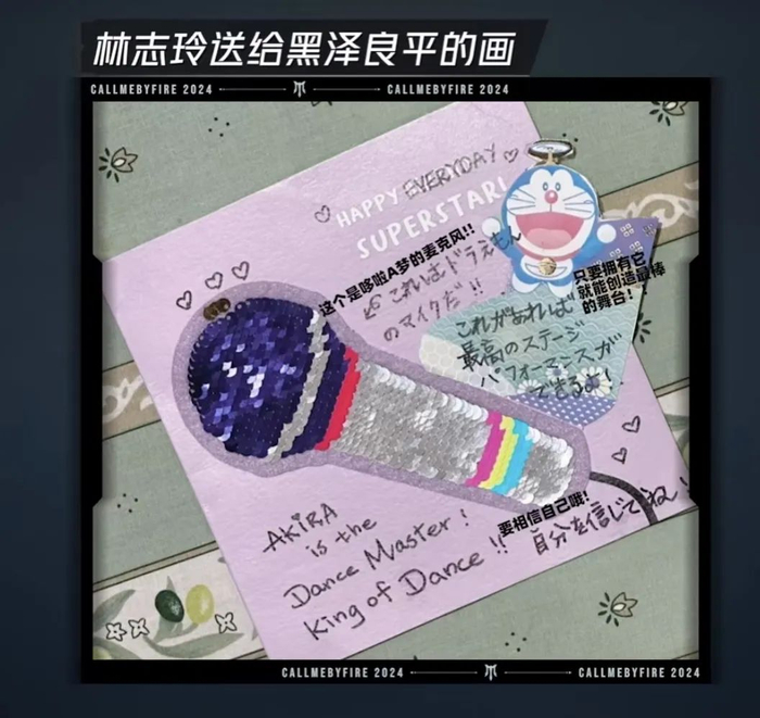 是林志玲为他制作的哆啦A梦的麦克风,童趣十足又充满了爱和鼓励:“拥有它就能创造最棒舞台!你的舞蹈已经在唱着歌了。”