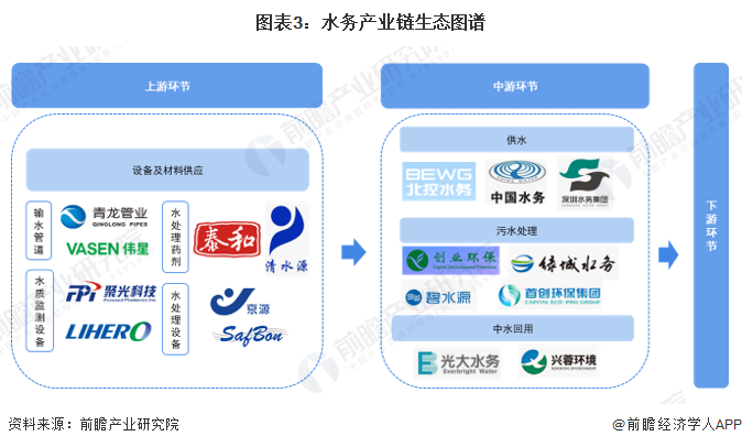 在水务产业链上游,供应设备及材料的代表性企业有青龙管业、京源环保、聚光科技、泰和科技等;产业链中游进行供水的代表性企业有北控水务集团、中国水务等,进行污水处理的代表性企业有创业环保、碧水源等,进行中水回用的代表性企业有光大水务、兴蓉环境等。