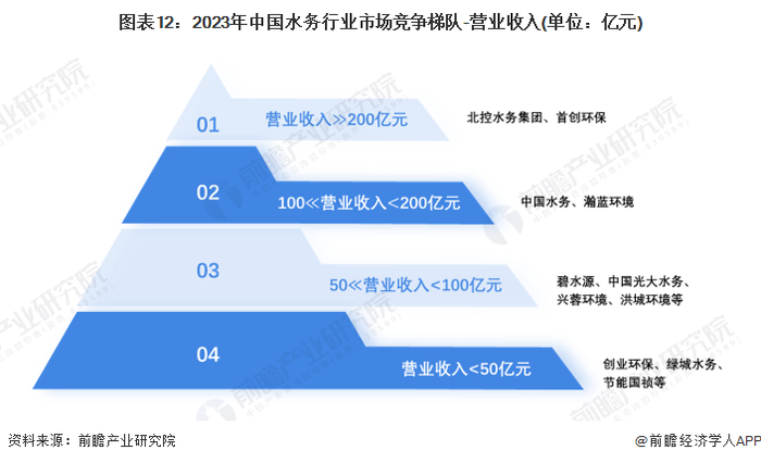根据营业收入作为划分依据,中国水务行业可划分为4个竞争梯队。第一梯队企业的营业收入在200亿元以上,包括北控水务集团和首创环保;第二梯队企业的营业收入在100-200亿元之间,包括中国水务和瀚蓝环境;第三梯队企业的营业收入在50-100亿元之间,包括碧水源、中国光大水务、兴蓉环境、洪城环境等;第四梯队企业的营业收入在50亿元以内,包括创业环保、绿城水务、节能国祯等。