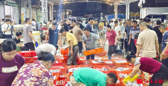8月20日凌晨,开渔后首批归来的深海捕捞渔船陆续回港。在市区海产品贸易市场,吆喝声、讨价还价声、车辆马达轰鸣声演奏出一曲“交响乐”,市场内灯火通明,一艘艘渔获满仓的深海捕捞渔船整齐地靠在岸边,渔民们正忙着卸载捕获而归的各类水产品,沉寂许久的渔港恢复了往日的繁荣和喧嚣。