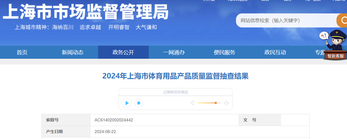 中国质量新闻网讯 8月22日,上海市市场监管局公布2024年上海市体育用品产品质量监督抽查结果。