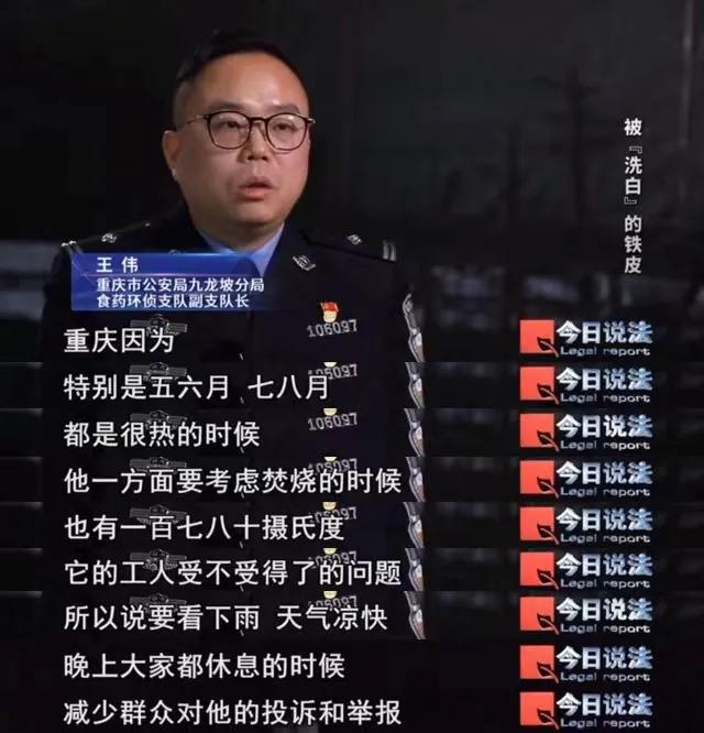 侦查员24小时蹲守一连七天,始终不见厂里有动静。终于,在第八天凌晨1点多的雨夜,厂房里的灯亮了。通过无人机,侦查员看到铁皮进入焚烧炉后,产生的气体并没有通过烟囱排放出去,而是由工人直接将焚烧炉门打开排出,焚烧时蒸发的有毒物质也随之直接排入大气,形成污染。专案组分析,深夜、雨天,便是这伙人选择焚烧铁皮的时机。