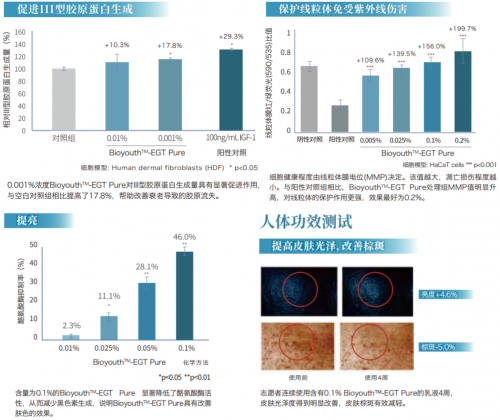 2023年,华熙生物自主研发生产的Bioyouth™-EGT Pure超纯麦角硫因已正式上市。该产品具有高纯度、高稳定性的特点,质量标准控制麦角硫因含量超过99%,且每批次都进行检验,以保证原料的稳定性。试验表明,Bioyouth™-EGT Pure不仅能够保护线粒体,还能促进Ⅲ型胶原蛋白生成,改善皮肤棕斑,提亮皮肤光泽。