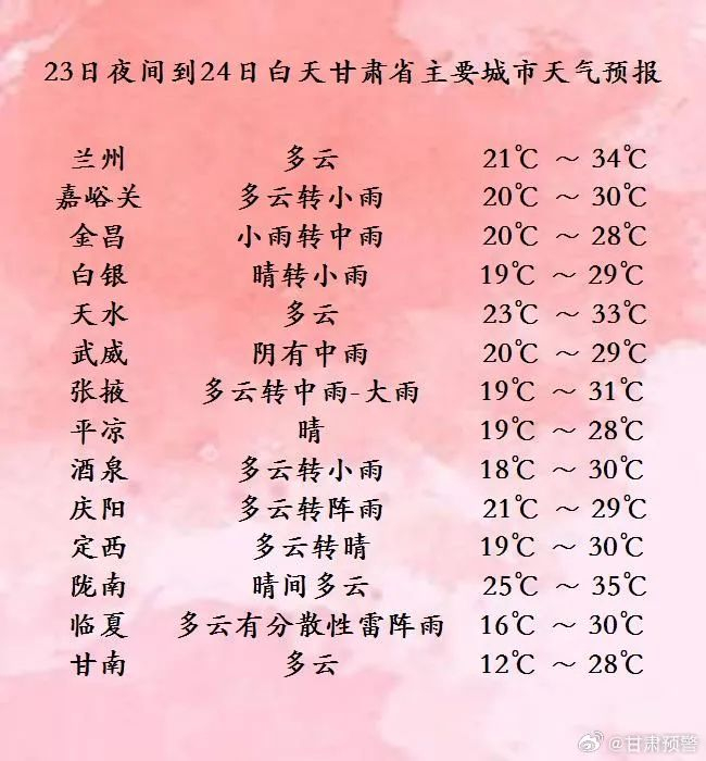 今天夜间到明天白天(08月23日20时-08月24日20时),张掖、金昌、武威三市多云转阴有小到中雨,局部地方有大雨;酒泉、嘉峪关两市多云转阴,部分地方有小雨;甘南、临夏、白银、兰州等州市晴转多云,局部地方有阵雨或小雨;省内其余地方晴转多云。另外,河西五市有4-5级偏东风,天水、平凉、定西三市和白银市南部有4-5级偏南风。