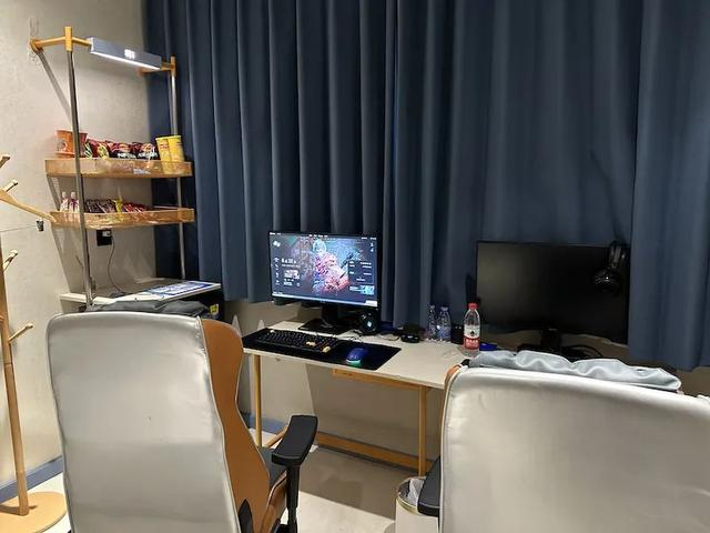 进入客房可以看到房内床品和洗浴等设备较为普通,而电脑配置较高,游戏体验感也非常不错。和一般酒店不同的是,电竞酒店内提供大量饮料和食品,甚至还有方便面等,这也符合电竞住客长时间打游戏后随时补充能量的需求。
