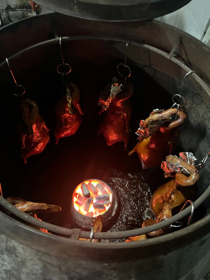 一只鹅,从制作到出炉,大约需要4个小时。这期间,由于鹅大小稍有出入,烧鹅师傅需时刻盯着瓦瓮,防止稍小一点的鹅烧过头。冯叔告诉我们,在店里仅是负责制作烧鹅的,便有三人。