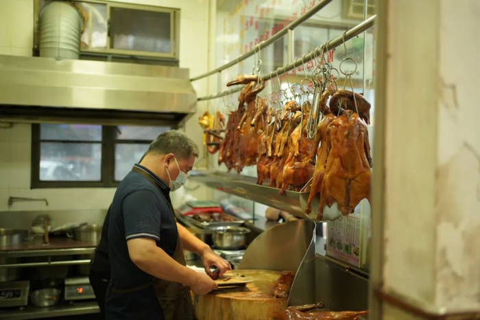 “搬下来了,位置大一点,这两年明显吃烧鹅的客人多了。”冯叔讲到,2009年开店以来,他都是在自家天台制作烧鹅,但近两年烧鹅需求量越来越大,家的天台慢慢地就不够用了。三年前,冯叔才在小店背后的巷子里,另外租下一间门店烤制烧鹅烧腊。