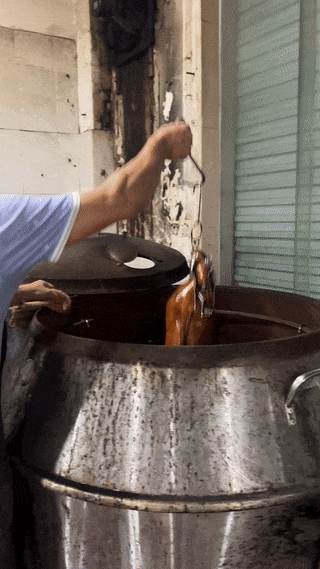 “我们的烧鹅刷的是大红浙醋,鹅烧出来的颜色偏金黄色。”冯叔讲到,与东莞其他烧鹅店不同,众和轩的烧鹅主要刷取带着浓郁清香的大红浙醋,重点保留鹅本身的风味。通过封腔、充气、风干等流程,最后进入瓦瓮,烤上50分钟。