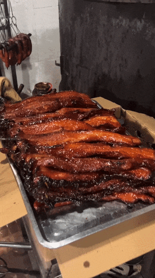 一条条形状规则的五花肉,肥瘦均匀,腌制后进入瓦瓮高温烘烤,肥油逐渐被逼出。由于烧得够透,肥肉部分香滑软糯,一抿就在唇齿间化开,瘦肉部分则尽情地汲取酱汁,肥瘦之间口感层次分明。