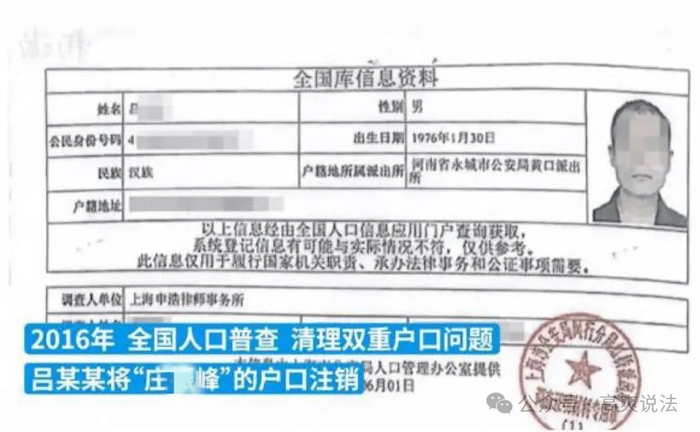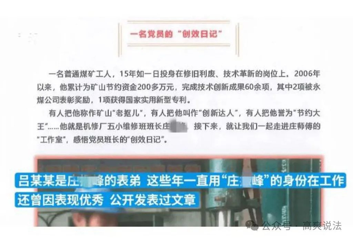 2023年4月9日,永城市公安局永煤矿区派出所出具的情况说明显示:庄某峰1996年9月从黑龙江牡丹江林管局大海林林业局建筑工程公司,以工人身份调入郑州矿务局,后被安排在超化煤矿工作,2006年9月调出,后档案转至永煤集团新桥煤矿。经比对,证实顶替庄某峰档案信息人员为吕某某。