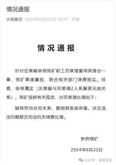 8月22日,河南新桥煤矿发布情况通报称,与吕某某解除劳动合同关系,撤销其各类荣誉,涉及违法问题移交司法机关调查处理。