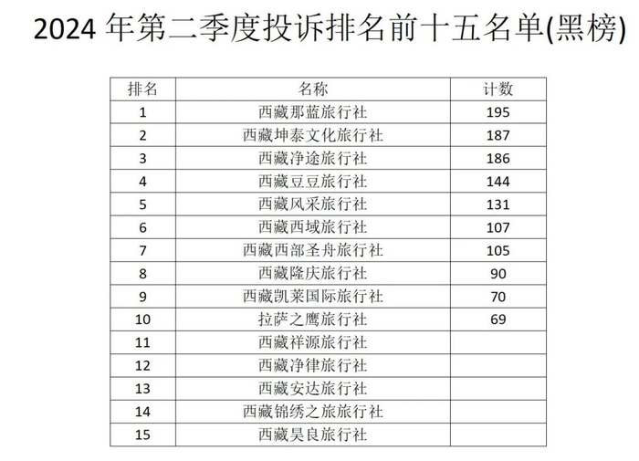 为深入贯彻落实《中华人民共和国旅游法》,督促我市旅行社诚信经营、守法经营,激励涉旅企业为游客提供优质服务,根据《拉萨市全域旅游动员大会》精神和《拉萨市实施旅游市场黑名单管理办法》(试行),结合2024年第二季度旅行社接待团队和人数、旅游投诉、违法违规案件、旅游行业服务质量等因素,现向社会公布2024年第二季度30家优质旅行社和投诉靠前15的旅行社名单(红黑榜),请各位游客谨慎参团,理性消费。