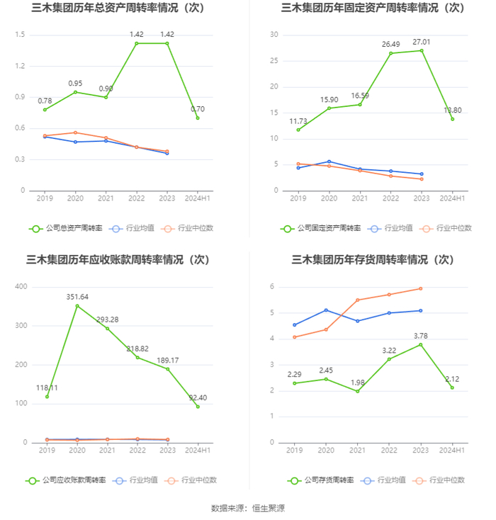 营运能力方面,2024年上半年,公司公司总资产周转率为0.70次,上年同期为0.78次(2023年上半年行业平均值为0.19次,公司位居同行业2/22);固定资产周转率为13.80次,上年同期为14.52次(2023年上半年行业平均值为2.01次,公司位居同行业5/22);公司应收账款周转率、存货周转率分别为92.40次、2.12次。
