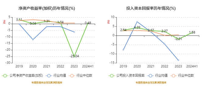 盈利能力方面, 2024年半年度公司加权平均净资产收益率为0.48%,同比下降0.33个百分点。公司2024年上半年投入资本回报率为1.58%,较上年同期下降0.32个百分点。