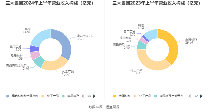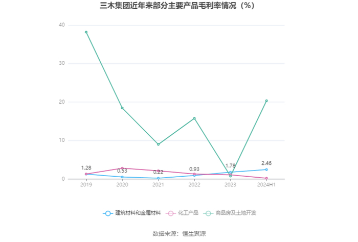 分产品看,建筑材料和金属材料、化工产品、商品房及土地开发2024年上半年毛利率分别为2.46%、0.21%、20.38%。