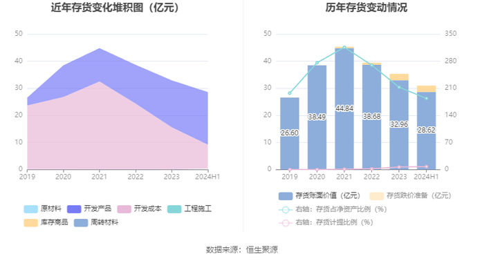 从存货变动来看,截至2024年上半年末,公司存货账面价值为28.62亿元,占净资产的183.92%,较上年末减少4.35亿元。其中,存货跌价准备为2.38亿元,计提比例为7.69%。