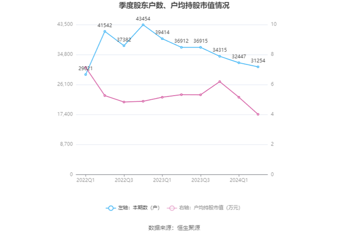 筹码集中度方面,截至2024年上半年末,公司股东总户数为3.13万户,较一季度末下降了1193户,降幅3.68%;户均持股市值由一季度末的5.16万元下降至4.02万元,降幅为22.09%。