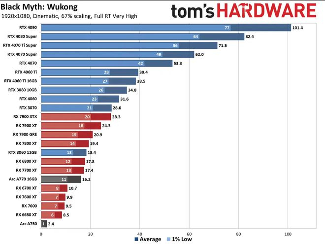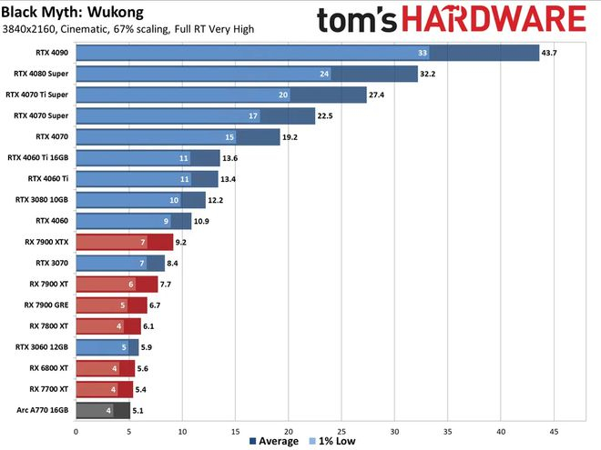 最后但并非不重要的一点(除了帧速率),本次有测试完全最大化设置的4K。英伟达RTX 4090平均为44fps,RTX 4080 Super刚刚超过30fps,最低降至20fps多。其他一切显卡都无法畅玩。换句话说,在具有《黑神话:悟空》这种图形复杂度的游戏上,我们距离实现全景光线追踪和所有花哨的功能还有很长的路要走。
