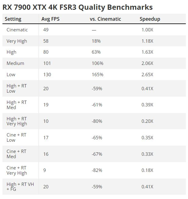 与基准影视级画质性能相比,光线追踪低等选项的高画质预设会导致性能下降59%。光线追踪中等选择预设会导致61%的下降,而超高光线追踪设置会使性能下降80%—例如,AMD RX 7900 XTX的运行速度是影视级画质的五分之一。GPU从在最大非光线追踪设置下至少还算合理可玩,变成了完全不够用。使用光线追踪模式升级到影视级画质预设会显示更大的增量:在低等、中等和超高的全景光线追踪模式下,性能分别下降65%、67%和82%。并且使用帧生成,使用高画质加光线追踪超高选项,则可以降到20fps。