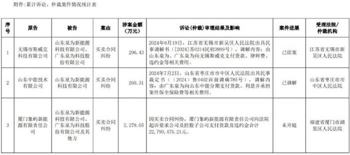 值得注意的是,披露2024中报期间,泉为科技还发布了关于累计诉讼、仲裁事项情况的公告。