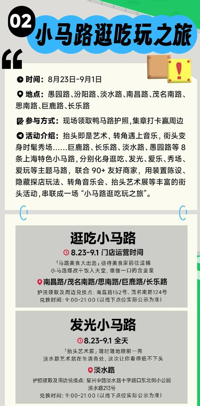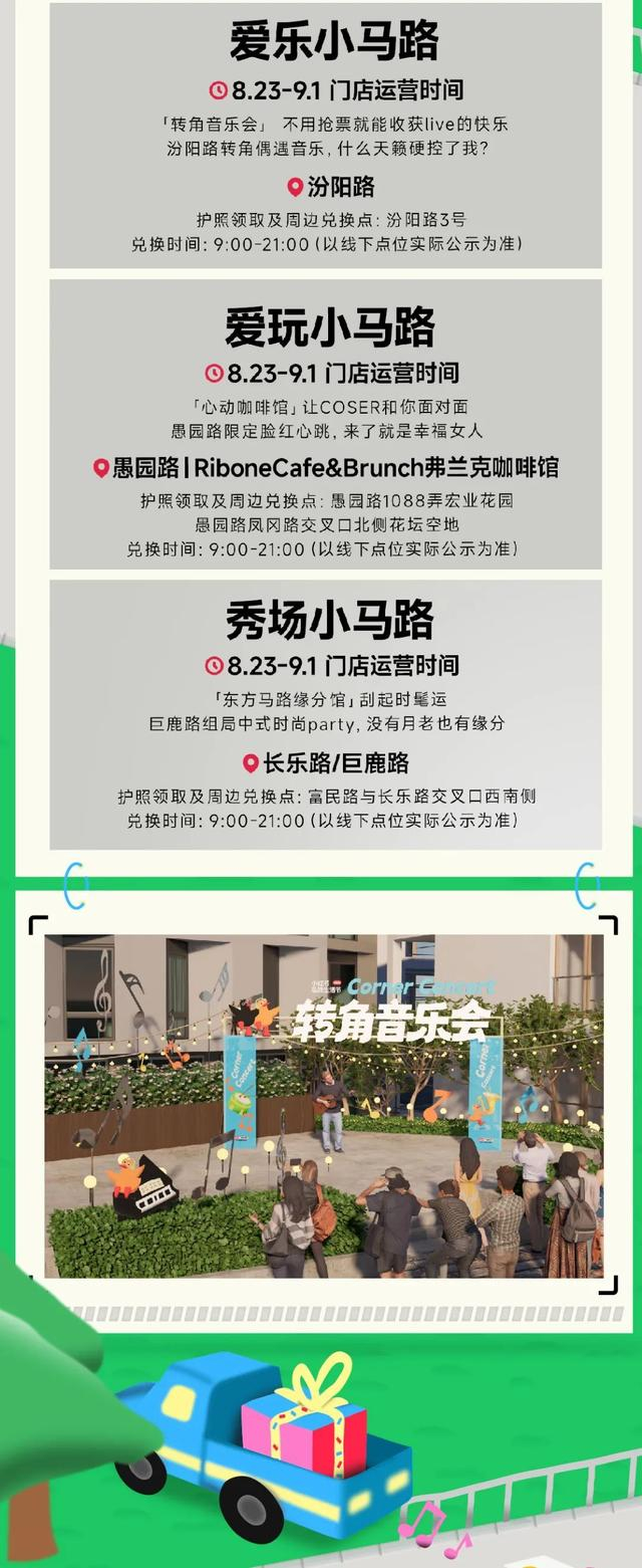 今年的主题小马路内容和主题比去年更丰富,共推出逛吃、爱乐、爱玩、发光、秀场5个主题,横跨上海市黄浦区、徐汇区、静安区、长宁区;包括愚园路、汾阳路、淡水路、南昌路、茂名南路、思南路、巨鹿路、长乐路等8条小马路。每条小马路会根据主题进行视觉设计,活动策划,以及联合商家设置打卡集章的趣味互动。另外在杨浦区大学路还设置了一条出片小马路,设置多样的打卡装置和周末限时彩绘斑马线。