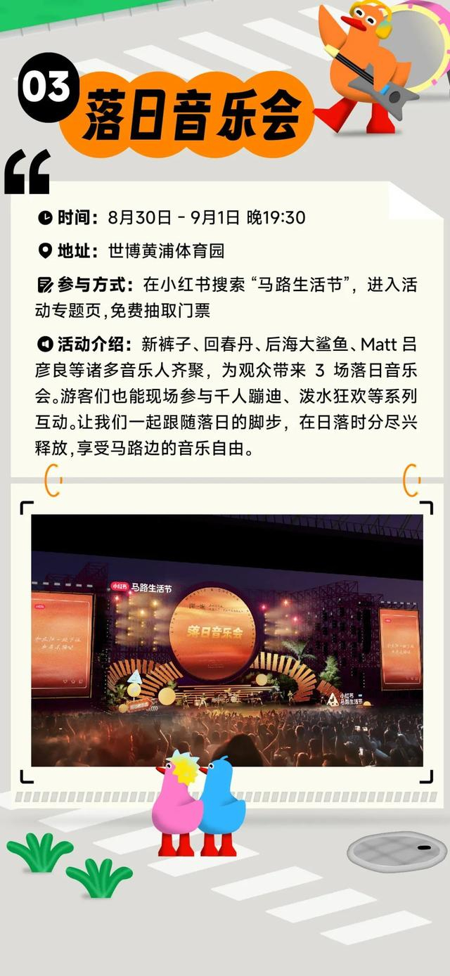 除此之外,8月30日至9月1日的黄浦体育园,多位音乐人将为观众带来永不落幕的“落日音乐会”。