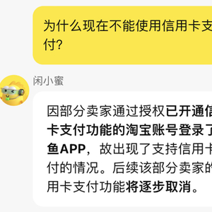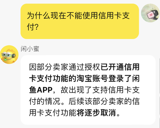 回复显示,因部分卖家通过授权已开通信用卡支付功能的淘宝账号登录了闲鱼APP,故才出现了支持信用卡支付的情况,后续该部分卖家的信用卡支付功能将逐步取消。