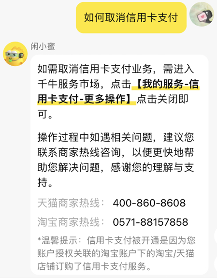 如果用户希望立刻、马上取消信用卡支付,也可以进入到千牛服务市场,通过点击【我的服务-信用卡支付-更多操作】来点击关闭即可。在回答取消信用卡支付问题时,闲鱼客服还提示了信用卡支付功能被开通的原因。