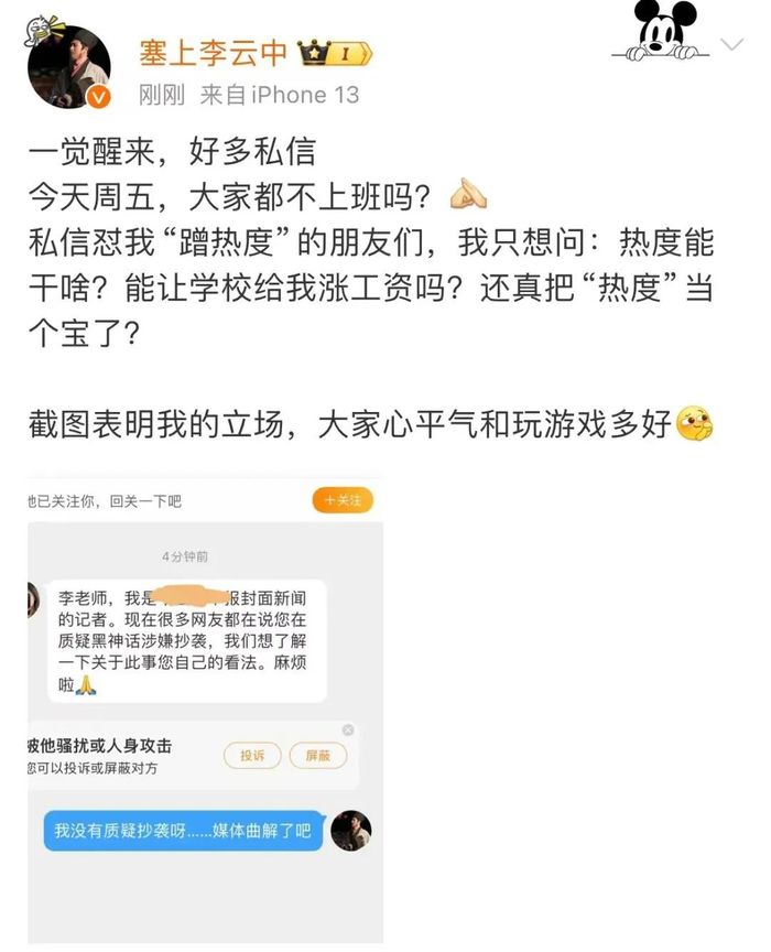 午间,针对汹涌的评论和私信,李云中在微博作出回应。他发文称,并没有蹭热度,也没有质疑抄袭。