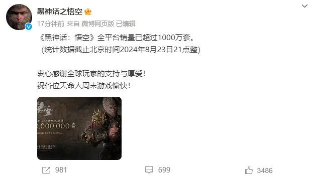 《黑神话:悟空》官方微博发布数据显示,