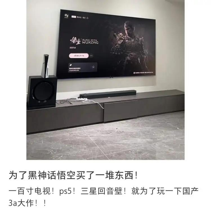 游戏发售三天,《黑神话·悟空》仍然热度不减,还有不少人在自己已有的Steam掌机、电脑等设备上玩过,觉得游戏体验不佳,立马将家中的装备以旧换新,换成“大屏电视+PS 5游戏机”的装备。