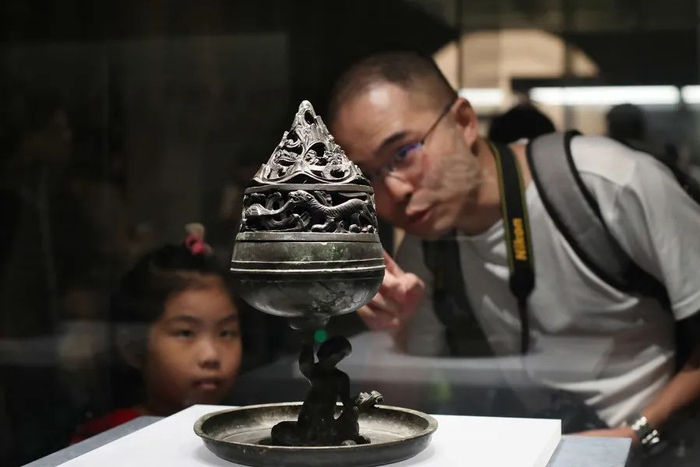 家长带着孩子看“骑兽人物博山炉”,由游戏开始关注文物。