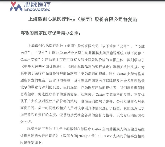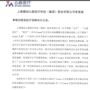 在8月23日的回复函中,心脉医疗除了逐一回应四方面的问题,更是直接承诺,在基本不影响出厂价格和利润的情况下,大幅压缩流通环节过高加价,将Castor支架等系列胸主支架产品终端价格调整为7万元左右或以下,降价幅度40%左右或以上,价格标准与行业内一致,以实际行动减轻患者和医保基金的压力,共同构建健康有序、可持续发展的市场环境。