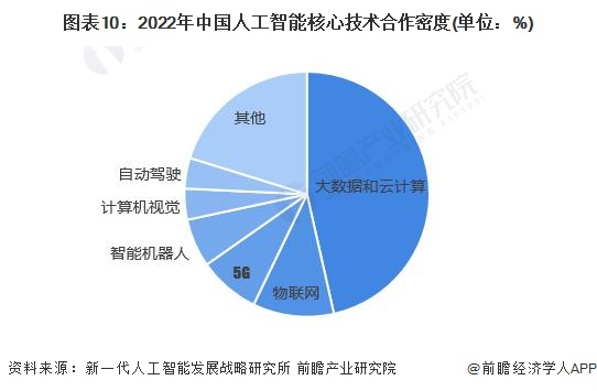 从人工智能核心技术的合作密度来看,大数据和云计算的占比接近一半,达到46.47%;其次是物联网和5G技术,分别达到10.7%和8.1%;智能机器人、计算机视觉、自动驾驶分别占比6.39%、4.08%、4.05%。