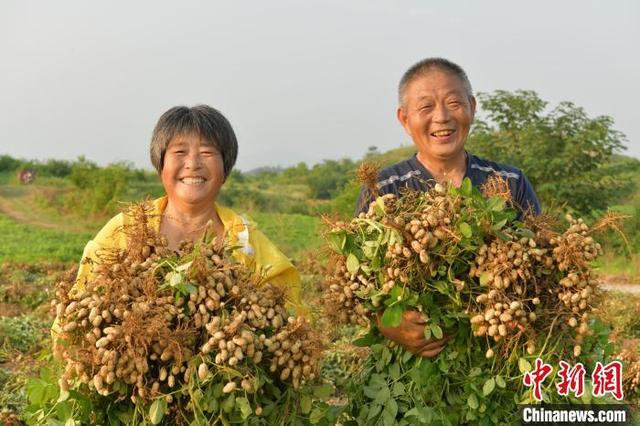 处暑时节,河南南阳镇平县王岗乡2000余亩花生迎来丰收。放眼望去,一片片绿油油的花生铺满山岗,农户们在田间地头忙着抢收、拉运、晾晒花生,享受着丰收的喜悦。近年来,该乡因地制宜调整农业种植结构,通过引进优质花生、高粱等经济作物,推动农户增收致富。图为王岗乡农户享受花生丰收的喜悦 。 时君洋 摄