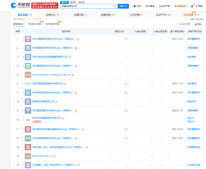 据天眼查,荣耀目前有15名股东,其中包括地方国资、产业链供应商、第三方资本等 。在2022年11月,荣耀完成了新一轮战略融资,新增了6名股东,包括京东方科技集团股份有限公司等。